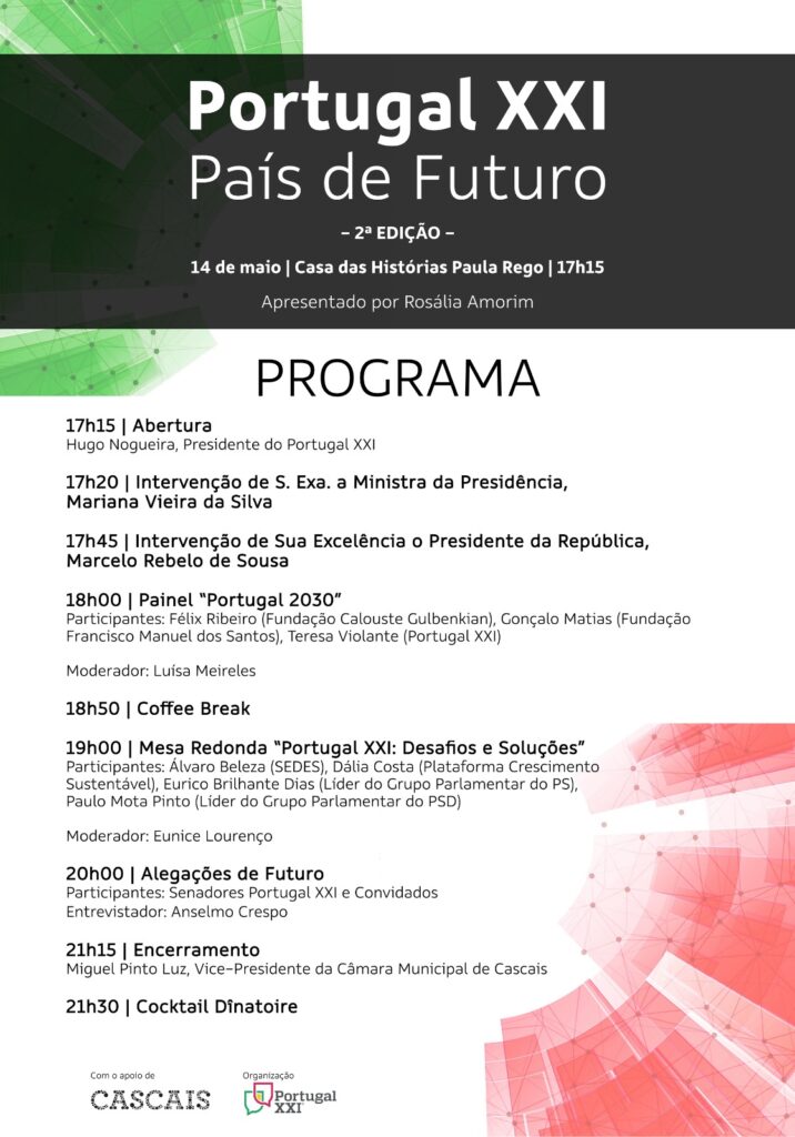 A 2.ª edição de “País de Futuro”, promovida pelo Portugal XXI, chega já no próximo dia 14 de maio e contará com a participação de Sua Excelência o Presidente da República, Marcelo Rebelo de Sousa, e de S. Exa. a Ministra da Presidência, Mariana Vieira da Silva.